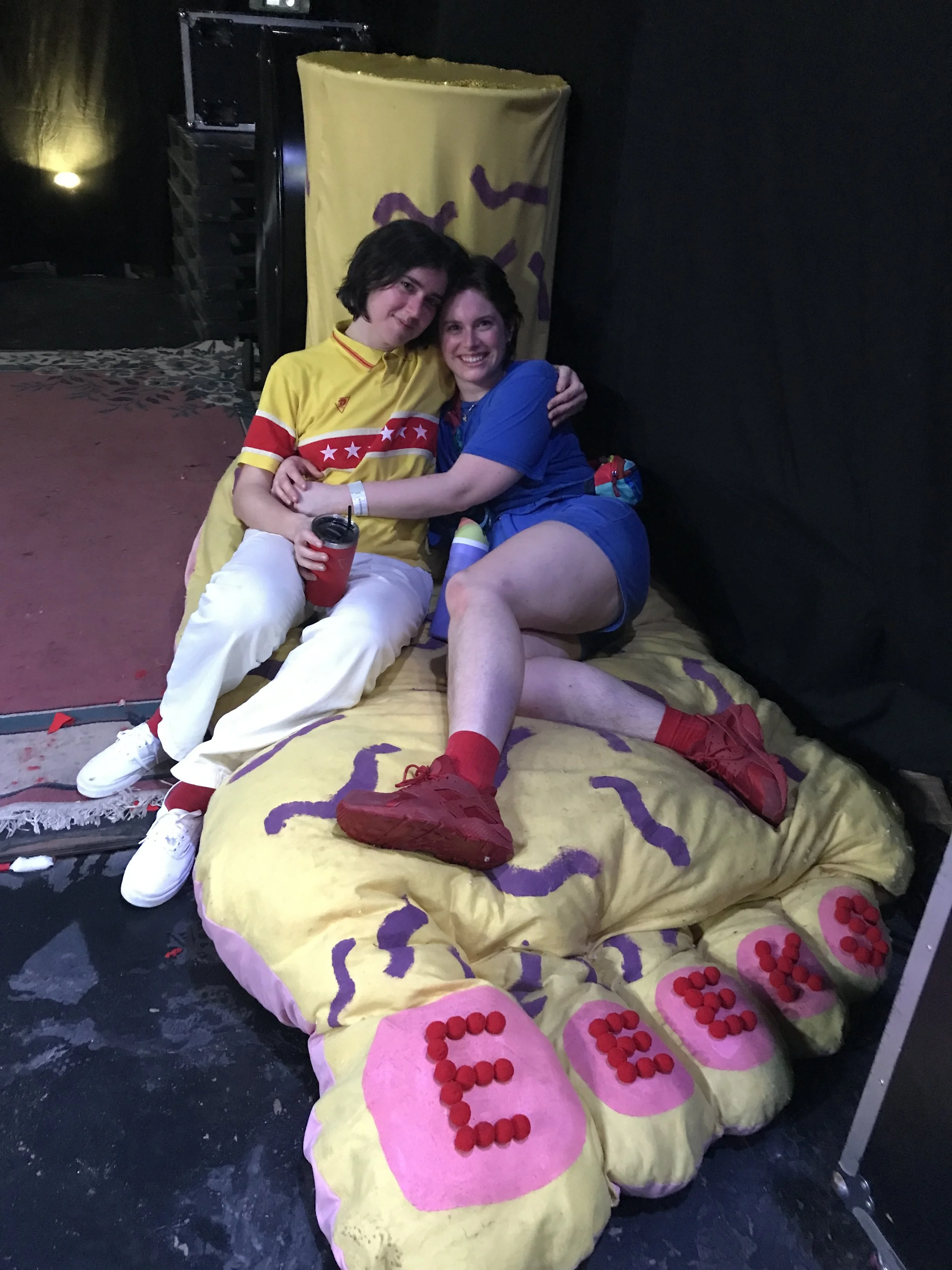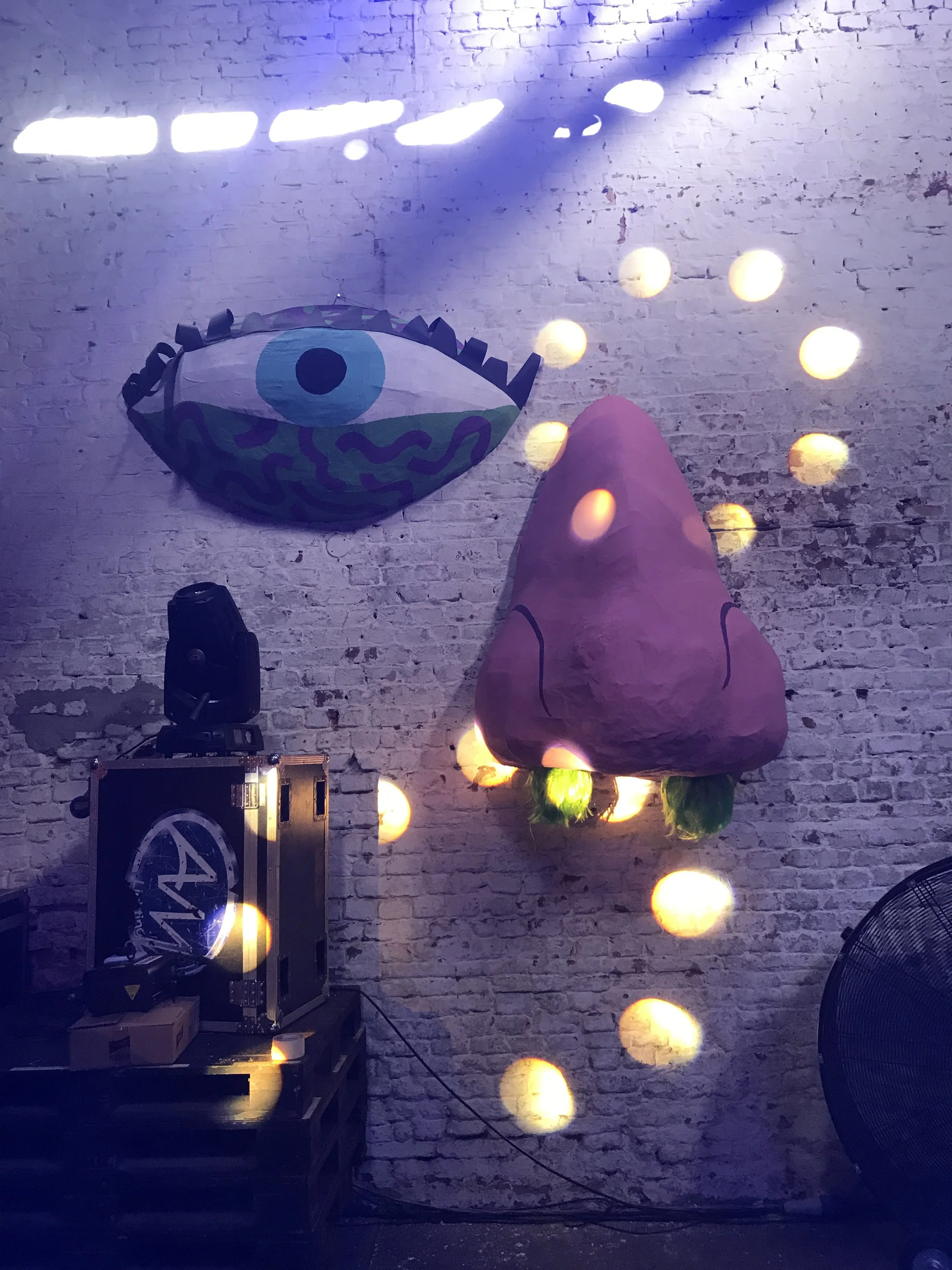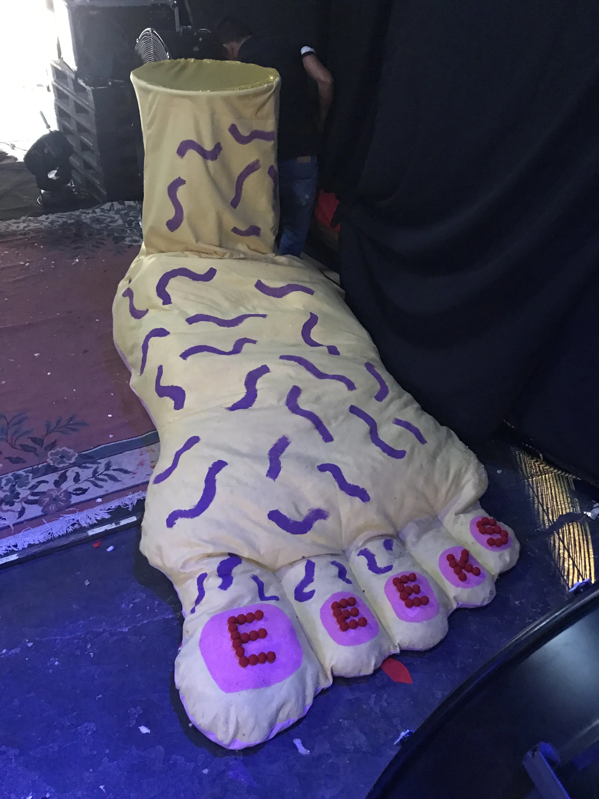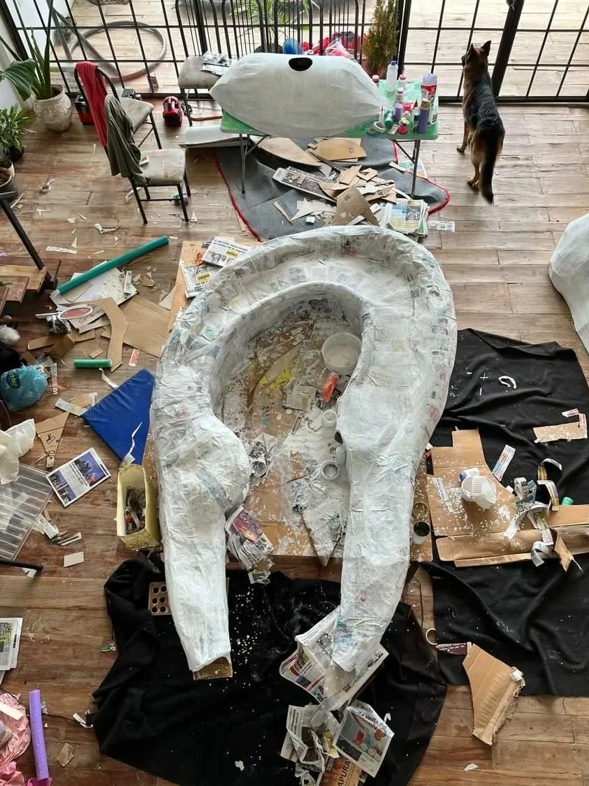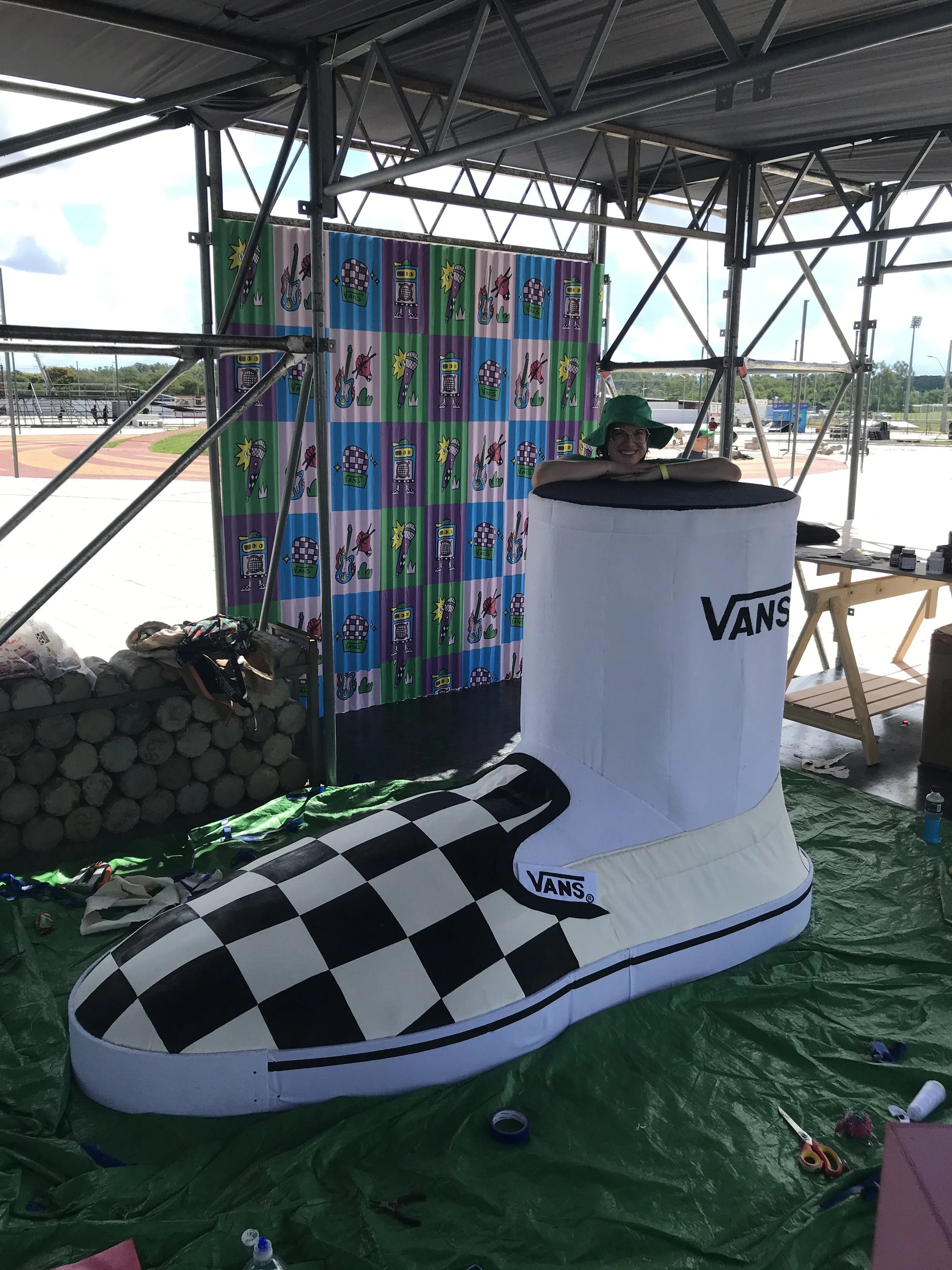 In March 2023 my partner, Ana Belén Diaz Sacco, and I traveled to Acunsíon, Paraguay for a month to help out and put on a series of shows with her band EEEKS. In collaboration with Aharon Emery and Mucho Flow, a creative event team in PY, I helped create immersive sculptures for a 2 night EEEKS event held at Nhi-Mu Teatro Aéreo. The first few rows of images were taken in Tobatí, Paraguay showing some of the “making of” which was a wild 5 day period from concept to install. Then are some images from the two shows at Nhi-Mu. It was a music/play/immersive art show extravaganza that will live in my heart forever! After that are some images of illustrations I did for EEEKS merch: cups, shirts and tote bags along with the surfaces they ended up on. My final project was making a giant xl slip-on, in collaboration with Mucho Flow, for the Vans booth at Asunciónico, one of the country’s big annual music festivals. We had 3 days to come up with the concept and fabricate. All in all it turned out great!